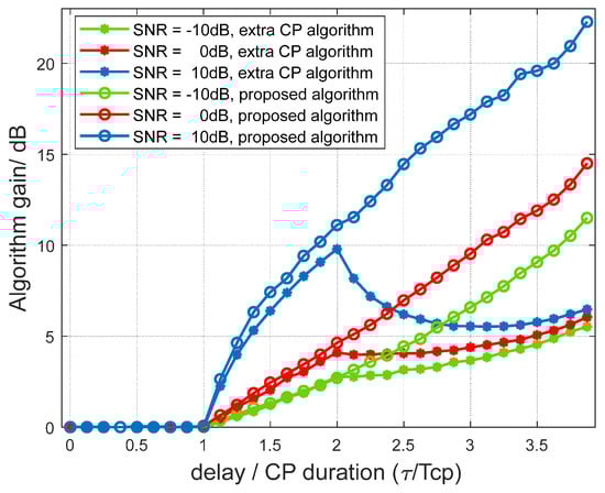 Figure 7 illustrates the relationship between algorithmic gain and the echo delay under different SNRs for various algorithms, comparing both the extra-CP algorithm [22] and the proposed algorithm in this paper. Define the algorithm gain as the improvement in target accumulated echo SNR when using the delay compensation algorithm compared to the original algorithm. When , both enhanced algorithms offer no gain over the original one. In the range , the two enhanced algorithms achieve nearly identical gains compared to the original algorithm, and the gain increases with delay. When , the gain of the extended CP algorithm decreases due to exceeding the CP duration, whereas the delay compensation algorithm continues to yield increasing gain, indicating that mainstream CP extension approaches merely postpone the degradation caused by CP overflow without achieving any fundamental breakthrough. On the contrary, since the delay compensation algorithm reduces ISI and ICI, and interference effects increase with higher SNR, the improvement brought by delay compensation is also enhanced. High SNR offers greater performance improvement compared to low SNR, which is a maximum of 20 dB performance gain. In addition, the proposed algorithm does not possess a theoretical upper bound in terms of sensing range if SNR or accumulation time is sufficient. However, in practical applications, its performance may be affected by transmission power limitations and the ambiguous target issue discussed in Section 4.