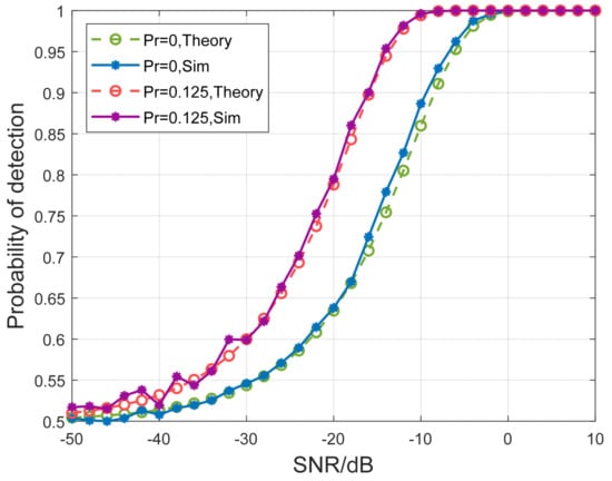 Similarly, under the hypothesis that holds, the test statistic , still follows the aforementioned distribution. According to the test statistic (27), the theoretical corresponding error probability can be expressed as