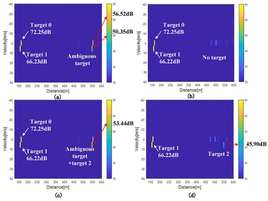 Figure 9 shows the processing results of the multi-target scenario under different conditions, and the simulation scenario model is illustrated in Figure 5, including stationary buildings (Target 0) and dynamic targets (Target 1 and Target 2). Assume that P(1) = 0.7, the redundancy , and the original SNR of the echo signal is 10 dB. Subfigure (a), without any ambiguity suppression, target 1 is clearly detected with a peak amplitude of 66.23 dB, while an ambiguous target appears at a coupled delay-Doppler location with a significant energy level of 50.35 dB. Due to the removal of communication information, as analyzed in (32), the noise floor differs between the true target and ambiguous targets across different range intervals. Consequently, the SNR observed in the resulting RDMs are 58.03 dB and 29.78 dB. In subfigure (b), by reducing the similarity between adjacent symbols, the ambiguous target is effectively suppressed. Target 1 remains detectable (63.22 dB), and the ambiguous region shows minimal residual energy at 23.25 dB. After evaluation, it is determined that the noise floor increases by only 3 dB, resulting in a final SNR difference of 52.22 dB between the true target and the ambiguous target. Subfigure (c) and (d) show the RDM results for the two-target scenario illustrated in Figure 5. Due to range and RCS limitations, target 2 is 35 dB weaker than target 1. In the absence of ambiguity suppression, the ambiguous target induced by target 1 may obscure target 2 in the RDM, making its detection challenging. In subfigure (d), by introducing a redundant sequence, the ambiguous target energy is reduced, similar to the effect observed in subfigure (b), thereby enabling the detection of target 2.