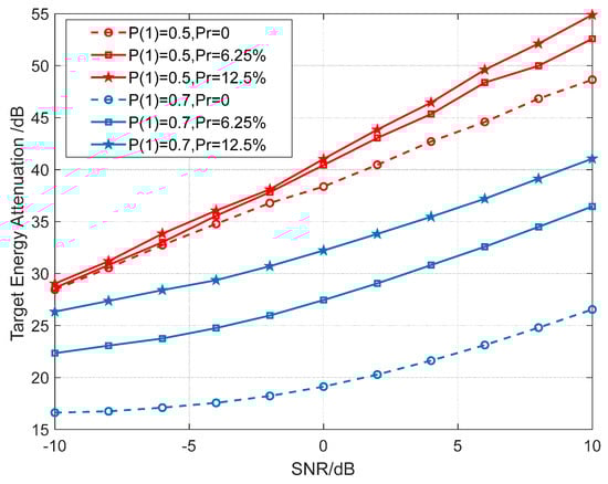 The energy attenuation of the target is defined as the difference between the SNR of the true target and that of the ambiguous target in the final obtained RDM. Figure 10 illustrates the relationship between the received SNR and the target energy attenuation under different conditions. The overall trend shows that the energy attenuation increases with the original SNR. This is because as the received SNR increases, the energy of the true target rises, while for ambiguous targets, it is primarily the noise floor that increases, thereby enlarging the difference between the two. On the other hand, under the condition of p(1) = 0.7, where the inter-symbol correlation is high, the energy of the ambiguous targets is relatively strong, resulting in lower energy attenuation. However, after introducing redundancy, there is a significant suppression effect on the energy of the ambiguous targets, with a maximum improvement of up to 15 dB. In the case of p(1) = 0.5, the suppression effect can reach up to 7 dB. Therefore, different redundancy ratios can be selected based on the target characteristics under different scenarios and different source characteristics.