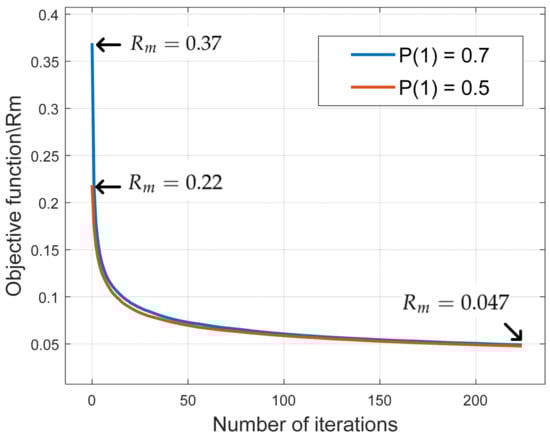 Figure 12 illustrates the relationship between the objective function value and the number of iterations of the SA algorithm during sequence design. Under different probabilities of ‘1’ bits, the objective function exhibits a consistent downward trend. However, the more imbalanced the ratio of ‘0’ to ‘1’ bits, the larger the correlation function value becomes. Meanwhile, a rapid decrease in the objective function is observed during the first 10 iterations. This is attributed to the use of random phase perturbation in the sequence design, where the phase is randomly selected within the range of 0° to 360°. Such random perturbation significantly affects the constellation points and leads to a swift reduction in correlation. Table 3 lists the representative points of the curve for the case of P(1) = 0.7, along with the corresponding computational time. In practical applications, using high-performance computing units can accelerate the computation time. and this curve can be used to flexibly balance the trade-off between the real-time performance and correlation characteristics of sequence design.