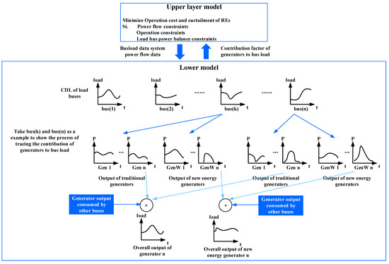 Because the contribution factors of each generator to each node are related to power flows, the power flow constraint of the system also needs to be considered, and the DC power flow model is used in this model. In the formula, is the injected power matrix of the node. , , and are the conventional generator connection matrix, the new energy generator connection matrix, and the load connection matrix. , , and are the conventional generator power matrix, the new energy generator power matrix, and the load matrix. is the line conduction matrix. is the line connection matrix. stores the conductance of each line. is the power angle matrix.