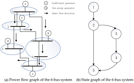 Figure 2a shows the power flow graph of the six-bus system, and the nodes are marked with ellipses in relation to the division of commons. Based on this, the simplified state graph of the six-bus system can be obtained in