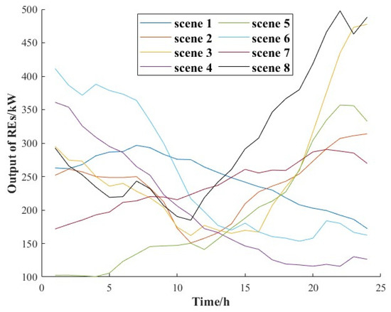 The output of wind power and PV are selected from the data published by PJM INT., L.L.C. (PJM) in 2018. The output distribution can be effectively obtained by clustering Algorithm 1; we aggregate it into eight typical output scenarios and count their probabilities. To simplify, we uniformly set renewable energy penetration at 30% in all scenarios.