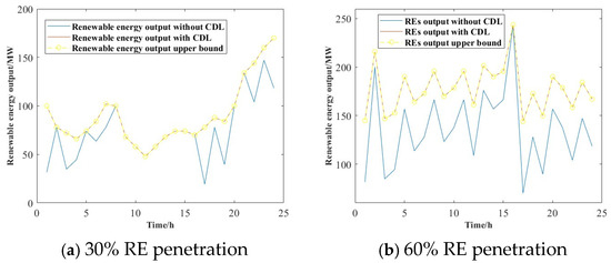 Figure 7a, RE is mostly consumed without CDL. But wind curtailment occurs in several periods when the total RE consumption reaches 84.1%. When the proposed CDL mechanism is considered, all REs will be totally consumed. For the 60% RE penetration scenario shown in