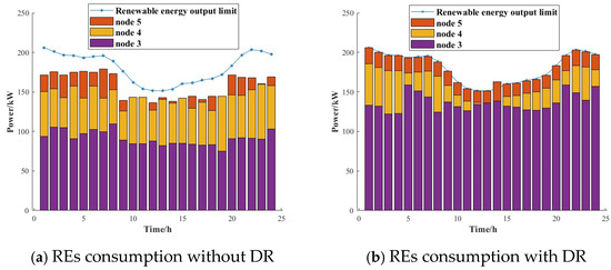 Figure 8, the curve represents the output upper limit of the system’s renewable energy units, and the “purple”, “yellow”, and “red” parts in the bar graph represent the renewable energy output consumed by load node 3, load node 4, and load node 5, respectively. The difference between the curve and the histogram is the power abandonment. Comparing the two figures, it can be seen that when there is no demand response, the power abandonment rate of the system within one day is 34%. After the implementation of demand response, the power abandonment rate drops to 12%, and the power abandonment rate of the system is significantly reduced. Considering the different capacity of different load nodes in the multi-node system to consume renewable energy, as shown in
