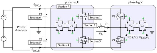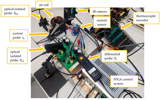 The laboratory setup is shown in Figure 9. All modulation and control blocks are implemented in an FPGA control system, which can be operated from a GUI on a workstation. A zero-flux current probe with high bandwidth (10 MHz) is used for tracing the inductor current, which is necessary for post-processing the inductor losses. In contrast, a current sensor with lower bandwidth (100 kHz) is sufficient for the current control loop. For measurement of gate-source and drain-source voltages, optical isolated voltage probes with high CMRR were used to achieve clear waveforms with the lowest common mode noise. A precision power analyser, ZES Zimmer LMG670 (ZES ZIMMER Electronic Systems GmbH, Oberursel, Germany), was introduced into the DC supply lines to measure the losses on the DC side. A series of temperature sensors were also installed to continuously monitor the condition of the system, such as an even load sharing on the phase legs. With the proposed test setup, the operating temperature of the power transistors could be kept at a very constant level for all operating points to ensure minimal dependency on the , which is known to be strongly temperature-dependent. This was accomplished by using a big heat sink with forced air cooling mounted on the top side of the cooled devices and measuring the heat sink temperature very close to the devices.