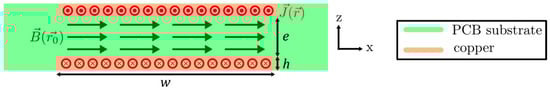 Figure 2 depicts the qualitative distribution of and . The current density is constant over the copper cross-section, where the upper and lower trace guide currents in opposite directions. Since , the magnetic field between the conductor traces is approximately homogeneous with only an x-component. The field outside this volume is negligibly small in comparison. As a PCB does not consist of only two traces with the same width and length, it is useful to subdivide a given layout into multiple sections, where each partial inductance is calculable with Equation (2).