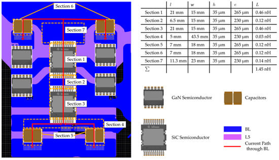 For visualisation, Figure 3 shows a subdivision of the designed layout and the respective results for each section, as well as the summed loop inductance of . Single components (see Figure 1) like MOSFET U1 form one section; for example, just like the nearly rectangular-shaped trace parts on the BL. In this case, a power loop through MOSFETS U1, U4 and capacitors C1, C2 is considered (2-level outer loop). The resulting current path closes via BL and the layer above (L5). Copper plates replace the components in simulation and calculation, which makes an important difference to the real system, because current densities are not comparable. Nevertheless, the suggested procedure should represent the principal behaviour and provide a good estimation. For a more accurate result, the components’ inductances must be determined.