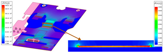 To simulate the stray inductance of the outer loop using Ansys HFSS (Ansys Electronics Desktop 2021 R2.2, Canonsburg, PA, USA), the loop is excited via a small port placed at U1. The resulting current flows through the copper planes and traces located on BL and layer L5. Although the traces on these layers differ in width—unlike the idealised geometry shown in Figure 5—the simulation results confirm that the current is confined to a narrow region where the copper traces overlap. This behaviour is attributed to the proximity effect, which causes current to concentrate in areas of lowest impedance.