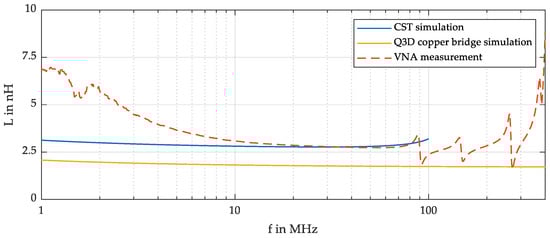 The CST simulation results show good agreement with the measured data within the frequency range corresponding to the switching transitions of the devices. In the experimental measurements, a frequency-dependent decrease in inductance is observed at lower frequencies, which is attributed to skin and proximity effects—phenomena that were not accounted for in the simulation models. While Ansys Q3D (Ansys Electronics Desktop 2024 R2, Canonsburg, PA, USA) simulation still provides a representative estimate of the stray inductance, the observed discrepancies highlight the impact of geometric simplifications in the simulation setup. These differences emphasise the importance of accurately modelling physical details when predicting parasitic effects in high-frequency power electronics.