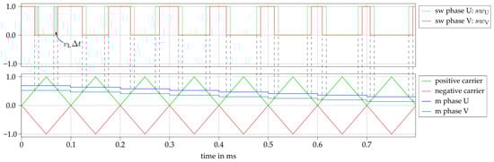 which causes a current flow . Furthermore, it is necessary to output phase voltages with different modulation degrees to be able to share the load current between all power semiconductors of a phase leg. For the constant current mode, the modulation degree is a sinusoidal function with a fundamental frequency of , due to its intended use as a grid-connected inverter. A flipped carrier-based POD modulator was implemented, with the ability to offset the modulation index for each phase in a very fine granularity. The shifting of ultimately allows the adjustment of the voltage time area (see Figure 7) and thus the inductor current.