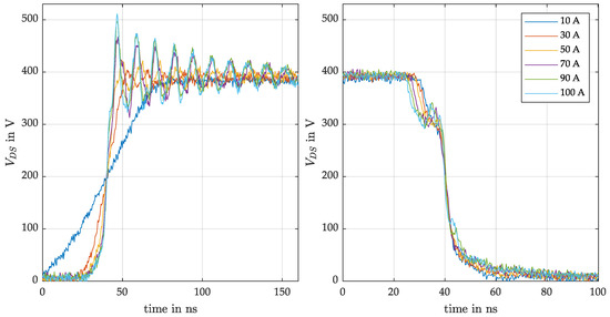 Based on this comparison—and especially on the observed overvoltage values of 10% at 50 A and 27% at 100 A (see Section 4)—the evaluated T-type converter shows appropriate loop inductance values, resulting in overvoltages that remain well within the safe limits of the devices’ rated voltage.