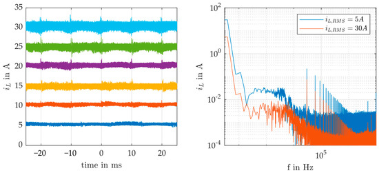 Inductor current during opposition method test for continuous current operation, (left): timeseries with modulated voltage of 50 Hz fundamental, (right): FFT of two selected current waveforms for switching frequency of 30 kHz.