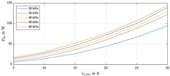 The curves in Figure 11, left, represent the inductor current waveforms containing distortions during the zero crossing of the modulated voltage, which has a fundamental frequency of 50 Hz. For higher currents up to 30 A, the ripple increases to ±1 A, which introduces more distortions in the lower frequency range (100 Hz to 10 kHz), as could be seen in the right plot, which shows the representation of two selected currents in the frequency domain. With this outcome, one can obtain the inductor losses in conjunction with the inductor impedance (Figure 8) and subtract them from the measured power on the DC input. Finally, a set of measurements for different currents and switching frequencies leads to the total inverter losses (for two-phase legs) depicted in Figure 12. The curves show a clear dependence of the losses on the switching frequency, which was to be expected. The difference between 20 kHz and 30 kHz appears to be quite large compared to 30 kHz and 40 kHz. It can be assumed that switching losses are the root cause for the proportional big gap, as the is constant due to the large heat sink and measured temperatures near the power devices. An extension of the OM measurements for AC currents would provide more precise findings, as this would allow the division of overall losses into the different loss mechanisms.
