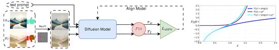 where is the sigmoid function, c the text prompt, and . Here, , and , are the intermediate noisy images at step t for the “winning” and “losing” samples, respectively, drawn via and