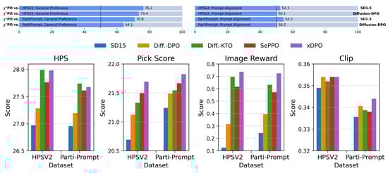 We evaluated the performance of the xDPO model in aligning with human preferences using both automated metrics and a user study. In the automated image quality evaluation, we employed four metrics: the first three were PickScore [20], HPSV2 [9], and ImageReward [19], each trained on human-preference datasets to predict which image a user is more likely to prefer under the same prompt. These three metrics not only assess preference prediction but also incorporate aesthetic judgment to some extent. In addition, we used CLIP [37] to measure prompt responsiveness by computing the image–text similarity score.