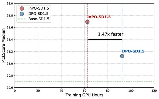For all SD1.5 experiments, we employ the AdamW optimizer [36]. Training is performed on two NVIDIA RTX 4090 GPUs (NVIDIA, Santa Clara, CA, USA), with a per-GPU micro-batch size of one preference pair and gradient accumulation over 128 steps. The learning rate is set to . Empirically, we observed stable and strong performance for values in the range [1000, 2000], and therefore report results using the configuration .