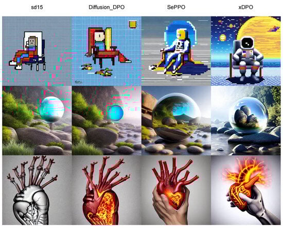 - Wallace, B.; Dang, M.; Rafailov, R.; Zhou, L.; Lou, A.; Purushwalkam, S.; Ermon, S.; Xiong, C.; Joty, S.; Naik, N. Diffusion Model Alignment Using Direct Preference Optimization. In Proceedings of the IEEE/CVF Conference on Computer Vision and Pattern Recognition (CVPR), Seattle, WA, USA, 16–22 June 2024; pp. 8228–8238. [Google Scholar]