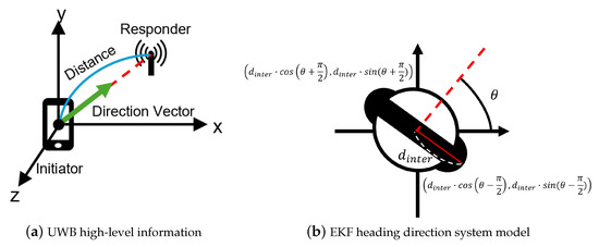When using UWB through a COTS device, we cannot obtain the CIR amplitude and phase information as we would with a dedicated UWB device. Consequently, we must rely on high-level UWB information provided by the UWB API [55,56]. Figure 2a illustrates the information obtainable via the API, which returns the distance between the initiator and the responder, as well as a unit direction vector. Therefore, if we denote the API output as the distance d and the unit direction vector (,,), we can express the responder device’s position in a three-dimensional Cartesian coordinate with the initiator located at the origin.