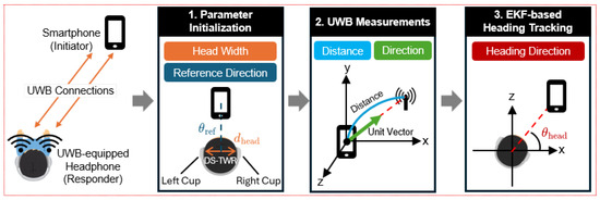 In the Parameter Initialization stage, the user briefly holds the head still to measure the interaural distance, the UWB initiator’s relative position from the head, and the initial heading direction state. To determine the interaural distance, we use the UWB API to measure the distance and direction from the initiator to each responder attached to the left and right earbuds. The interaural distance is then computed from the earbud position coordinates obtained via Equation (9). After initialization, in the UWB Measurements stage, the initiator gathers distance and direction values from the responder at both ears. The EKF-based Heading Tracking stage then uses the initialized values as correction metrics for UWB measurement errors. We operate UDirEar’s EKF on an initiator (smartphone) to maintain the energy efficiency of responder (earbud) since the EKF is a computaionally intensive algorithm. Collectively, these stages calibrate the system geometry, acquire real-time UWB data, and apply EKF-based corrections to deliver robust heading direction tracking.