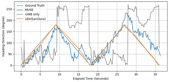 Both MUSE and UDirEar capture the overall triangular trend, but MUSE exhibits considerable jitter and coarser steps, whereas UDirEar follows the trajectory more smoothly and with finer detail. This difference arises because UDirEar relies solely on the measurements at time t to estimate the heading direction at time t, whereas MUSE incorporates the entire measurement history from time 0 to t. Since MUSE incorporates all measurements from time 0 up to the current instant, the errors at each step accumulate into a cumulative error, which can lead to performance degradation. Furthermore, UDirEar infers heading from the xz-plane coordinates of ear-mounted UWB sensors and uses an EKF to compensate for the current step’s measurement error.