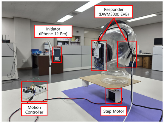The experimental hardware consists of a responder–initiator pair for UWB signal exchange and a step-motor-based motion controller for precise heading direction adjustment. An iPhone 12 Pro (Apple, Cupertino, CA, USA) serves as the UWB initiator, while Qorvo DWM3000EVB and nRF52840-DK (Qorvo Inc., Greensboro, NC, USA) modules act as responders. Since UWB wireless earbuds are not yet readily available, we used the dedicated devices as responders compatible with the initiator. To accurately control the heading direction of a dummy head fitted with these responders at both ears, we employed 42BYGHW811 step motors (Wantai Motor, Beijing, China) driven by A4988 step motor drivers (Allegro Microsystems, Manchester, NH, USA), all coordinated by an Arduino Uno-based motion controller (Arduino, Chiasso, Switzerland).