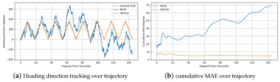 Figure 7b plots the cumulative MAE over elapsed time. Although there is some initial jitter, UDirEar maintains an almost flat cumulative MAE, whereas MUSE’s error grows continuously. By the end of the trajectory, the cumulative MAE of our approach is 4.65, compared with 69.71 for MUSE. This dramatic difference demonstrates that UDirEar provides stable tracking over a long time.