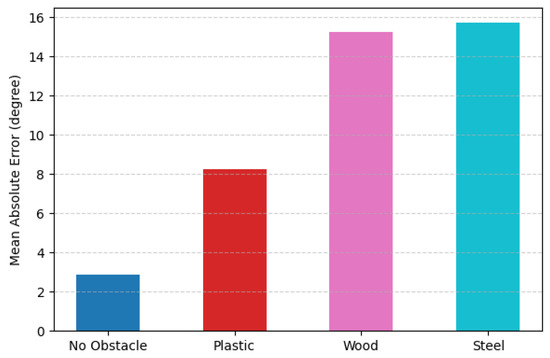 Figure 8 shows the MAE for LoS (no obstacle) and each NLoS case. This error increases from 2.85 in LoS to 8.23 with plastic, 15.24 with wood, and 15.69 with steel. This drop in performance is due to occlusion-induced UWB signal attenuation, which reduces range accuracy and degrades angular precision. Materials inducing greater signal attenuation correspond to higher measurement errors, with steel exhibiting the strongest attenuation and producing the largest error, followed by wood and then plastic.