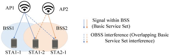 During data collection, the test network topology is illustrated in Figure 1: under the same frequency band configuration, two Access Points (APs) were deployed, each transmitting downlink data to their associated terminal devices (STAs). The dataset records not only the network topology configuration, traffic load, threshold parameters, and RSSI between nodes but also key frame-level statistical information collected during testing, such as transmission duration per node, modulation and coding scheme (MCS), number of spatial streams (NSS), packet error rate (PER), and actual throughput.