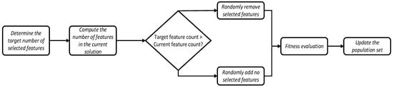 - Adjust the number of features: If the number of selected features for any individual exceeds num_features, adjustment is required:If select_features > num_features, randomly deselect (select_features − num_features) features.If select_features < num_features, randomly select (num_features − select_features) additional features.