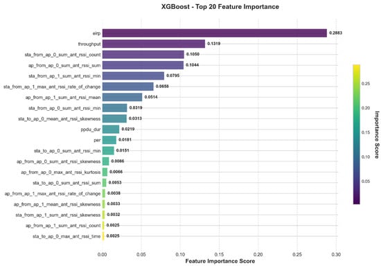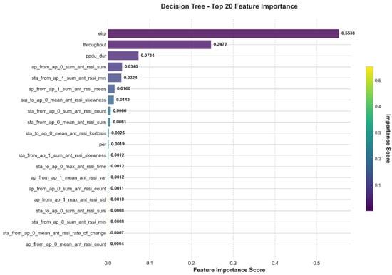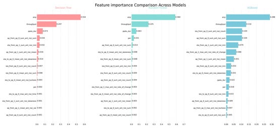 Throughput ranks as the second most important feature across all three models, with importance values of 0.2472 in Decision Tree, 0.2254 in Random Forest, and 0.1319 in XGBoost. This indicates that throughput also has strong explanatory power for system performance and may reflect the intrinsic relationship between device communication quality and stability. Additionally, the models differ in their sensitivity to other features. Both the Decision Tree and Random Forest methods identify ppdu_dur (PPDU duration) as the third most important feature, highlighting its strong discriminative ability in traditional information gain-based tree models. In contrast, the XGBoost model assigns relatively higher weights to RSSI-related features such as sta_from_ap_0_sum_ant_rssi_count, ap_from_ap_0_sum_ant_rssi_sum, and sta_from_ap_1_sum_ant_rssi_min, suggesting that the gradient boosting mechanism is better at capturing nonlinear patterns in RSSI statistical features. Looking at overall statistics, the average feature importance across the three models is 0.0227, but the standard deviations differ: Decision Tree (0.0896) and Random Forest (0.0923) are relatively high, whereas XGBoost’s standard deviation is 0.0514. This implies that XGBoost distributes importance more evenly, showing a more balanced reliance on multiple features and potentially stronger generalization capability.