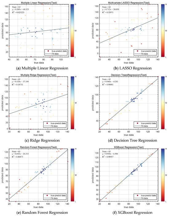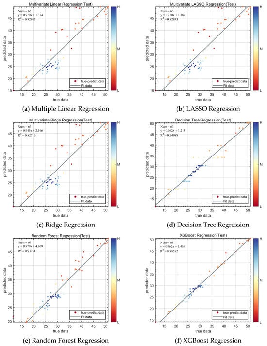 This study employs multiple linear regression, LASSO Regression, Ridge Regression, Decision Tree Regression, Random Forest Regression, and XGBoost Regression to build prediction models. The fitted plots and evaluation results of each model are shown in Figure 8 and Table 4.
