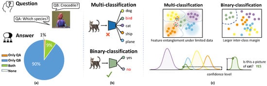 Comparative analysis of decision-making frameworks. (a) Human response accuracy under different question formats: QA (multi-choice) vs. QB (binary). Distribution shows 90% correct exclusively for QB (blue), 9% correct for both (green), 1% correct exclusively for QA (orange), and no incorrect answers (white segment). (b) Classification performance comparison: multi-class classifier misidentifies cat as bird, while binary classifier correctly identifies. (c) Feature space comparison: left shows multi-class feature entanglement (overlapping colored points), right shows binary classifier’s separated features with larger inter-class margin. Lower panel demonstrates higher confidence in binary classification (green peak).