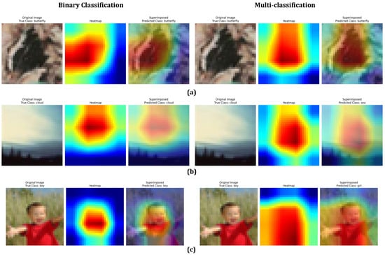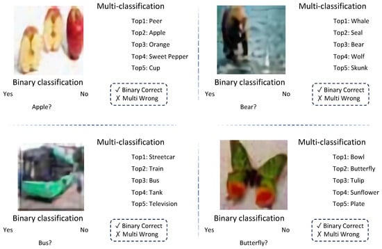 Based on the TPR analysis, binary classification appears to surpass multi-class classification. However, this comparison may not be entirely equitable. This is due to the inherent limitation of discrete binary classifiers, which cannot inherently handle multi-class decisions. The simple voting strategy incurs a steep degradation in classification performance exponentially. To address this limitation within multi-class classification tasks, we propose a method for integrating binary classification into a multiclass framework. This method involves evolving the multi-class space into a final binary classification space to enhance decision-making. In the subsequent section, we will elaborate on this methodology. Furthermore, we visualize the CAM (class activation mapping) heatmaps for both the multi-class and binary classifiers in Figure 4, ensuring controlled variables such that both models were trained on identical data. The results demonstrate that for samples correctly classified by both classifiers, the binary classifier exhibits more precise localization within its regions of interest. Crucially, for instances where the multi-class classifier makes an error while the binary classifier classifies correctly, as shown in Figure 4b,c, the binary classifier consistently focuses on discriminative regions relevant to the target class. For example, for the “cloud” class, the multi-class classifier correctly highlights the location of clouds in the sky region. However, for distinguishing the “boy” class, the binary classifier effectively concentrates on facial features critical for the boy/girl distinction, enabling its correct classification.