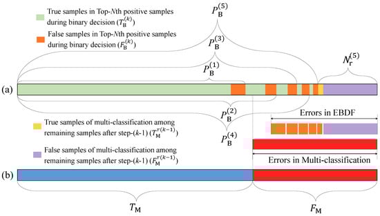 Comparison of error propagation in EBDF and multi-classification frameworks. (a) Five-step progressive decision process in the EBDF framework: denotes true samples (green) in the top-k positive samples, and denotes false samples (orange) during the k-th binary classification step. represents the remaining sample set after -step filtering, where (yellow) and (purple) correspond to multi-class true and false samples, respectively. (b) Multi-classification error distribution: (blue) and (red) indicate correctly and incorrectly classified samples in direct multi-classification. The right-side comparison demonstrates the fundamental error difference between EBDF’s hierarchical error correction and multi-classification’s global error patterns.