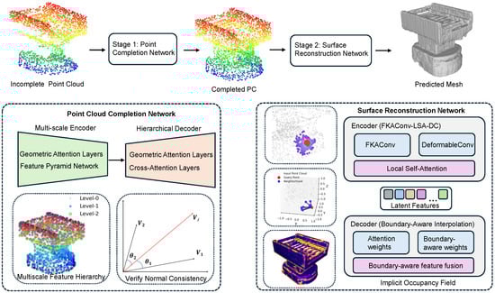 Current methodologies for 3D surface reconstruction from point clouds, while having progressed significantly, still face critical limitations in the demanding context of industrial settings [16,17,18]. Traditional geometric approaches often falter in the presence of noise and sparsity, struggling to preserve sharp features, thin structures, and complex topologies characteristic of industrial components. While learning-based methods, particularly those employing implicit neural representations, have demonstrated superior robustness, they often presuppose relatively clean and complete input data [19]. Although many prior works adopt two-stage pipelines, their ultimate performance is highly contingent upon the output quality of the initial completion network [20]. More crucially, traditional reconstruction networks employed in the second stage frequently exhibit limited robustness when processing the inevitably imperfect point clouds generated during completion. These networks typically assume clean and complete inputs, making them prone to losing fine-grained structures or amplifying residual noise, artifacts, and geometric inconsistencies inherited from the completion phase. Such deficiencies ultimately compromise the fidelity and reliability of the resulting DT models.