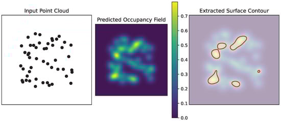 To reconstruct accurate and high-fidelity 3D surfaces from incomplete point clouds in DT applications, we propose an adaptive reconstruction pipeline based on point-wise convolutional encoding and boundary-aware occupancy interpolation. To improve conceptual clarity, Figure 2 presents an intuitive example of occupancy-based interpolation. This illustration shows how sparse point observations are transformed into a continuous occupancy field, which is then thresholded to extract coherent surface boundaries.
