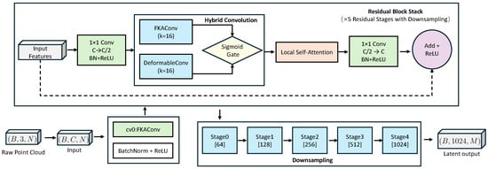 Overview of the proposed encoder architecture based on stacked residual blocks. Starting from raw point cloud input , the input features are first processed by an initial convolutional layer (cv0) followed by batch normalization and ReLU activation. The resulting features are then passed through a stack of five residual blocks, each containing a hybrid convolution module that adaptively fuses Deformable Convolution and FKAConv via a learnable sigmoid gate. This is followed by local self-attention and a 1 × 1 convolution to restore channel dimensions. A shortcut connection and optional max pooling are applied before the residual addition and ReLU activation. The output is a latent representation of shape , progressively downsampled across stages.
