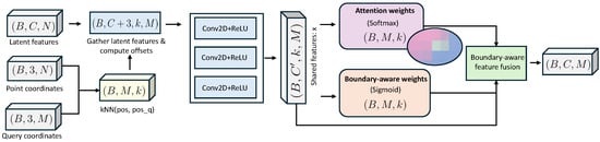 Illustration of the boundary-aware multi-head interpolation decoder. Latent features are aggregated via k-NN and fused with geometric offsets. Attention weights (Softmax) are rescaled by learned boundary-aware modulation weights (Sigmoid) to enhance sensitivity near structural boundaries.