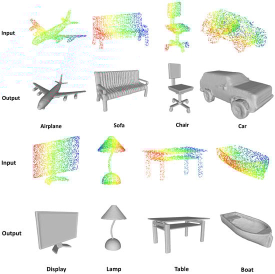 - Choy, C.B.; Xu, D.; Gwak, J.; Chen, K.; Savarese, S. 3d-r2n2: A unified approach for single and multi-view 3d object reconstruction. In Proceedings of the Computer Vision–ECCV 2016: 14th European Conference, Amsterdam, The Netherlands, 11–14 October 2016; Proceedings, Part VIII 14. Springer: Berlin/Heidelberg, Germany, 2016; pp. 628–644. [Google Scholar]