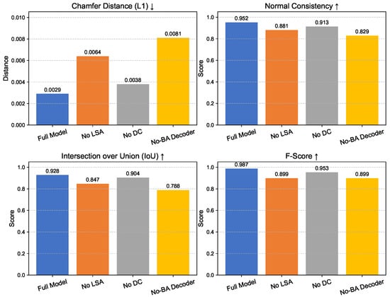 The results presented in Table 6 and illustrated in Figure 8 reveal several important insights regarding the contributions of individual components within the proposed reconstruction pipeline. Removing either the Deformable Convolution or the Local Self-Attention module leads to a noticeable degradation in performance across all evaluation metrics, underscoring their complementary roles in capturing fine-grained geometric features and maintaining structural consistency. In particular, the exclusion of the Local Self-Attention mechanism results in a substantial reduction in F-Score, exceeding 8%, which highlights its critical importance for modeling long-range dependencies and preserving global shape coherence. Furthermore, the absence of the boundary-aware weighting in the decoder yields the most pronounced decline in Intersection-over-Union and Normal Consistency, demonstrating that this mechanism is essential for accurately reconstructing thin structures, sharp edges, and other boundary-sensitive regions. As shown in Figure 8, the comparative bar charts provide a clear visual summary of these trends, facilitating an intuitive understanding of how each module impacts reconstruction quality. Collectively, these findings confirm that the integration of adaptive convolution, self-attention, and boundary-aware interpolation is indispensable for achieving high-fidelity surface reconstruction, especially in scenarios characterized by sparse or noisy point cloud inputs. Overall, the ablation study demonstrates that each component contributes distinct and synergistic benefits, and their combination is crucial to realizing state-of-the-art reconstruction performance.