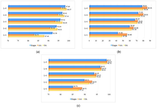 | OA (%) | 87.48 ± 1.31 | 88.42 ± 0.49 | 94.60 ± 0.14 | 94.99 ± 1.36 | 92.67 ± 1.14 | 96.84 ± 0.97 | 98.74 ± 0.46 | |