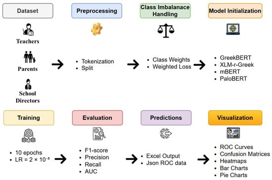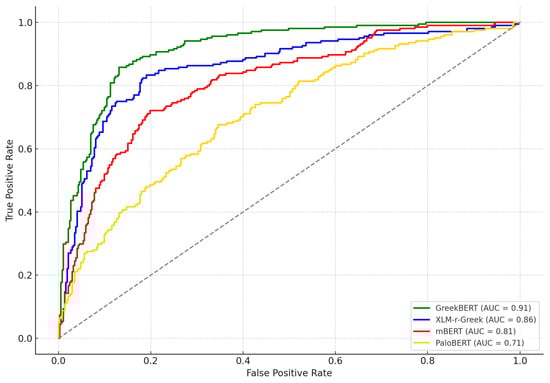 The models selected for this study are state-of-the-art transformer-based architectures derived from BERT, a leading approach in NLP that significantly outperforms conventional ML methods in various text analysis tasks, including SA and text classification [77]. Large Language Models (LLMs) were not used in this study due to the small size and domain-specific nature of our dataset. Prior research has shown that LLMs often yield suboptimal or unstable results when fine-tuned on limited data [78,79], a finding supported by our preliminary experiments with available Greek-compatible LLMs. Models were specifically chosen because they support the Modern Greek language (mBERT), either exclusively or as a part of multilingual training (GreekBERT, XLM-r-Greek, PaloBERT). Greek-specific models such as Greek-BERT [80] and PaloBERT [81], along with their sentiment-specific fine-tuned variants, PaloBERT Sentiment [81] and Greek-BERT Sentiment [82], provide specialized performance due to their pre-training and fine-tuning on Greek text datasets. Additionally, multilingual models based on the XLM-RoBERTa architecture [83] have demonstrated efficiency when specifically fine-tuned for Greek SA, thus combining broad linguistic coverage with task-specific precision. Models like Multilingual BERT (mBERT) [84] and XLM-RoBERTa Base [83], while not fine-tuned for SA, offer a multilingual foundation and can achieve excellent results, upon fine-tuning, in Greek sentiment datasets. The flexibility of these models makes them highly suitable for conducting accurate SA research in Greek, ensuring reliable insights into the sentiments expressed in Greek textual data.
