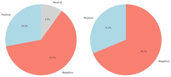 The exclusion of the neutral class not only simplifies the dataset, but also enhances the clarity and focus of the subsequent SA. The change in distribution reflects the dataset’s alignment with binary sentiment classification needs, particularly for tasks leveraging transformer-based models, which typically operate more effectively with distinct sentiment labels. This transformation underscores the critical importance of preprocessing in ensuring that the dataset aligns with the methodological requirements of sentiment classification. Furthermore, the results demonstrate the high proportion of negative sentiments in the data, suggesting potential challenges in classification balance and emphasizing the need for strategies, like class weighting. This preprocessing step is vital for SA and allows for more focused and interpretable results.