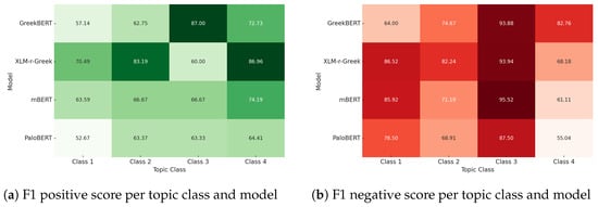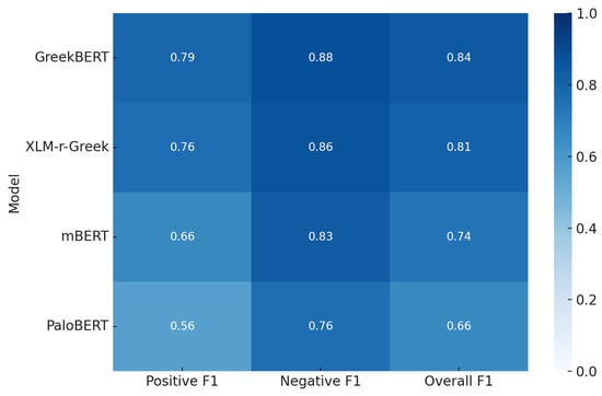 Figure 4 presents a heatmap illustrating the positive, negative, and overall F1 scores achieved by the four BERT-based models with the combined PSFD, SCH, and TCH datasets as one input. Darker shades indicate higher F1 scores. GreekBERT consistently outperformed the other models across all categories, followed closely by XLM-r-Greek. In contrast, PaloBERT showed lower performance, particularly in the positive class. The heatmap provides a clear visual summary of the comparative strengths and weaknesses of each model.