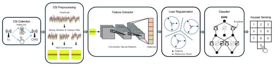 We depict our Wi-Fi keypad sensing system in Figure 1, which is composed of three main modules: a CSI data collection module, a preprocessing module, and a keypad input recognition module. The CSI data collection module is comprised of a transmitter and a measurement device that collects channel state information. We configure an ESP8266 microcontroller as a transmitter which sends a Wi-Fi frame over a 20 MHz Wi-Fi channel in the 2.4 GHz frequency band every 10 ms. We install the Nexmon tool [33] on a Raspberry Pi 4 to collect CSI data whenever the transmitter sends a frame. The preprocessing module structures the measured data into a form suitable for effectively training a deep learning model in the keypad input recognition module. Specifically, it extracts the data subcarrier components from the measured data, applies the Hampel filter to mitigate distortions introduced by noise and interference in a Wi-Fi channel over which the Wi-Fi data is measured, and subsequently transforms the processed data into a three-dimensional image format. The resulting image is fed into the keypad input recognition module, which senses the keystroke on a keypad by learning the feature representations of the images. In this module, we design a KAN-based classifier to better distinguish CSI features belonging to different classes by leveraging its capacity to learn complex nonlinear relationships in the feature space. In addition, we devise two regularization methods that make CSI features belonging to the same class become more tightly clustered. The increased compactness of each class feature facilitates more precise class boundary separation by the KAN-based classifier, which enhances the sensing accuracy of our keypad input recognition module.