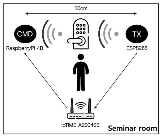 To construct a dataset for a keypad input recognition, we setup a CSI measurement environment as shown in Figure 4. The experimental setup consists of a Wi-Fi transmitter, a CSI measurement device (CMD), and a commercial access point. We use an ESP8266 microcontroller as a transmitter, which has a low-power, cost-effective Wi-Fi chipset. We configure the ESP8266 in the station mode to enable connection to the AP. In our setup, the role of the transmitter is solely to generate periodic traffic for CSI measurement purposes, rather than to establish communication with its peer receiver. To achieve the goal, we take advantage of the connectionless nature of UDP, which enables a transmitter to send UDP packets irrespective of whether the destination host or the peer UDP process exists. In other words, we configure the transmitter through the UDP socket program to send packets to a non-existent IP address within the same subnet, eliminating the need to assign a destination MAC address. We configure the payload size of each UDP packet to be one byte. The communication protocols add protocol-specific headers at each layer in order to enable proper data transmission. Thus, as the UDP payload passes through the transmitter’s protocol stack, standard headers from the UDP, IP, and Wi-Fi layers are added, resulting in a complete Wi-Fi frame that is transmitted over the Wi-Fi channel. For the UDP packet transmission interval of the transmitter, we refer to commonly used values in prior studies [35] and set it to 10 ms so that ms. The Nexmon is installed on a Raspberry Pi 4B model to capture the CSI data whenever the transmitter sends a UDP packet. We use a ipTIME A2004SE as an access point. The role of the CMD is to measure the channel state information of Wi-Fi frames transmitted over the wireless channel. To enable this functionality, we configure the Wi-Fi interface of the CMD in the promiscuous mode and set it to monitor the same Wi-Fi channel used by both the transmitter and the AP. To measure only the channel state information of Wi-Fi frames sent by the transmitter, we also configure the CMD to collect CSI only when the source MAC address of a captured Wi-Fi frame matches that of the transmitter. All the devices follow the IEEE 802.11n standard and they operate on a channel with 20 MHz bandwidth in the 2.4 GHz frequency band where each channel has = 52 data subcarriers. The distance between the transmitter and the CMD is configured as 50 cm, and a door-lock device with a keypad is placed at the midpoint between the transmitter and the CMD. Ten participants are recruited for the experiment. To construct a labeled dataset for sensing model training, we design a data collection process. Each participant is instructed to press a predefined keypad button during a controlled measurement session in which the transmitter periodically emits UDP packets. During this interaction, the CMD records the corresponding CSI sequences. Each CSI segment collected under the condition of button being pressed is labeled with the class . This labeling procedure is applied across all the participants and all keypad buttons in the door lock, resulting in a labeled dataset wherein each CSI segment is explicitly annotated with its associated ground-truth class. Thereby, we are able to construct a labeled training dataset for supervised learning. Since each participant presses each digit in the door lock (0 to 9) for two minutes, twenty minutes of data are collected per participant, which results in a total 200 min of data. The measurement experiment has been conducted in a university seminar room. There are numerous access points in the building where the seminar room is located. Since the access points are managed by different authorities, their operating channels vary temporally. Therefore, during the measurement experiments, the surrounding Wi-Fi communication environment is not controlled. In other words, at each measurement instance, the Wi-Fi channel with the least observed congestion by the AP is selected for CSI measurement.