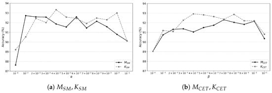 In this study, we configure the parameters of the proposed keypad input recognition model with reference to existing research findings. Specifically, guided by [7], we design the feature extractor as follows. We set four convolution blocks for the feature extractor, each with a fixed stride of . For each block i, the number of output channels (i.e., ) is set to , and , respectively. According to [16], our KAN-based classifier uses B-splines, with a grid size of and spline order of . When we train the model, we set the size of mini-batch to 256 and the maximum number of epochs to 300. The training process may stop before the maximum number of epochs if the validation loss does not decrease for 30 consecutive epochs. In the case where the saliency map-based regularization is used, we configure to search for each . The learning rate is set to 0.001 whenever training a model.