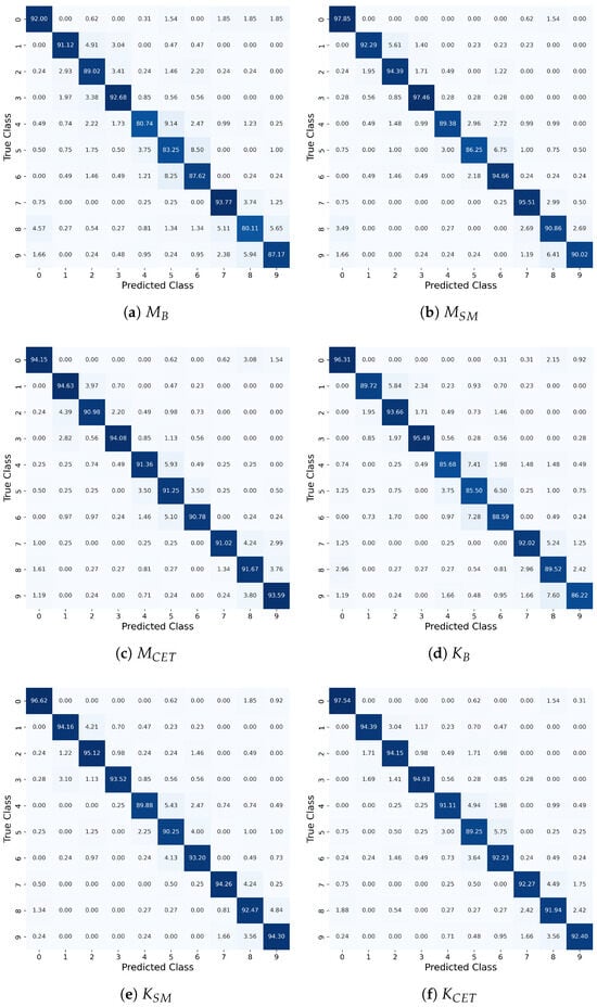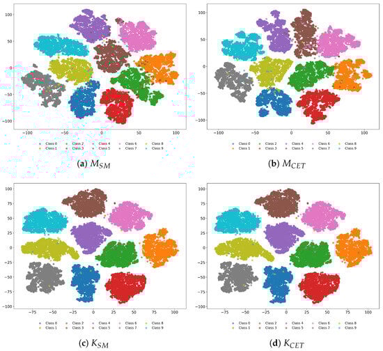 In Figure 8, we illustrate the t-SNE plots for the logit vectors extracted from each model when . Compared to the results in Figure 5, we can see that logit vectors belonging to the same keypad input class are more tightly clustered when the loss regularization is applied than when only the cross-entropy loss is used. These structural differences are closely linked to the improvements in the keypad input recognition accuracy. As shown in the confusion matrices of Figure 9, the models trained with the loss regularization exhibit higher accuracy compared to those without the loss regularization.